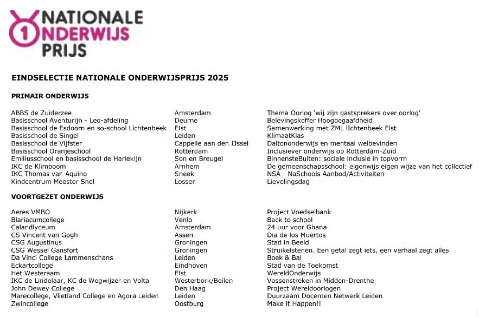 Dan maken we de winnaars bekend van de Nationale Onderwijsprijs 2025. Uit alle hoeken van het land hebben scholen inspirerende en uiteenlopende projecten ingezonden en dit zijn ze: de trotse inzenders die zijn opgenomen in de eindselectie. Maar… welke school gaat er met de befaamde prijs vandoor?